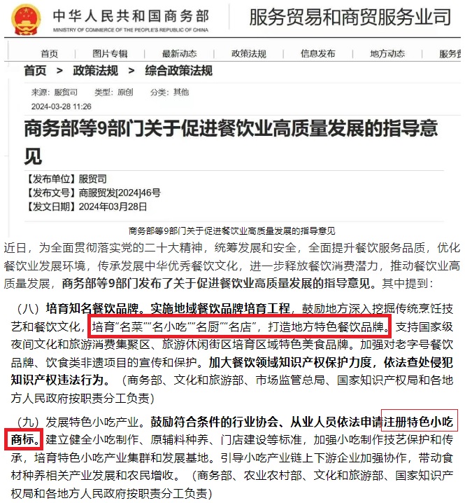 培育知名餐饮品牌。依法申请注册特色小吃商标。