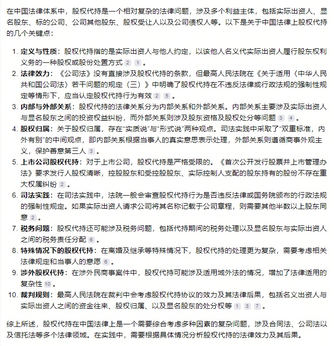 综上所述,股权代持在中国法律上是一个需要综合考虑多种因素的复杂问题,涉及合同法、公司法以及信托法等多个法律领域。