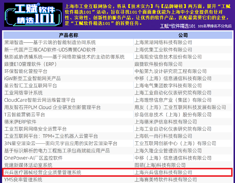 上海兴兵信息科技有限公司,成立于2014年,是国内领先的医疗器械行业的软件开发服务提供商,长期专注于为中国医疗器械生产经营企业提供线上线下信息化咨询、整体解决方案与服务,并致力于为医疗器械生产经营企业及监管部门检查管理提供一站式解决方案服务。