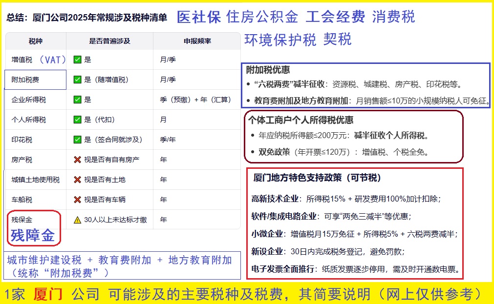 以下是2025年(基于当前税收框架,预计基本税制保持稳定)一家典型的厦门公司可能涉及的主要税种及其简要说明。
