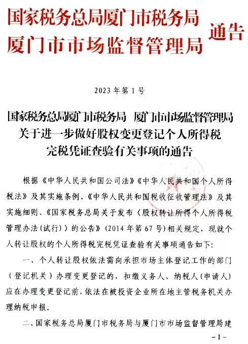 根据《国家税务总局厦门市税务局 厦门市市场监督管理局关于进一步做好股权变更登记个人所得税完税凭证查验有关事项的通告》要求, 2023 年10 月1 日起 ,有限责任公司的自然人股东进行出让股权变更登记、股东认缴出资额备案时,注册登记窗口工作人员会打印提供《个人股权转让涉税问题即问即答》,提醒办理人员知悉相关规定;如果是线上提交申请,市场监管局网上审批系统办理页面,会弹窗展示 《即问即答》内容。